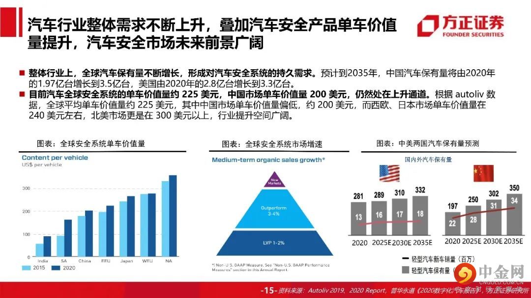 并购整合接近尾声,成本结构优化+新订单周期开启,安全业务有望再创辉煌。公司已经完成了前期的整合,正在逐步强化对海外标的掌控。具体表现在:2021业绩拐点初现,Q3芯片扰动和成本上涨下毛利率企稳,管理费用下降。整体行业上,全球汽车保有量不断增长,形成对汽车安全系统的持久需求。预计到2035年,中国汽车保有量将由2020年的1.97亿辆增长到3.5亿辆,美国由2020年的2.8亿辆增长到3.3亿辆。汽车安全业务是公司占比最大的业务。2020年汽车安全业务营收331.3亿元,占比69%。