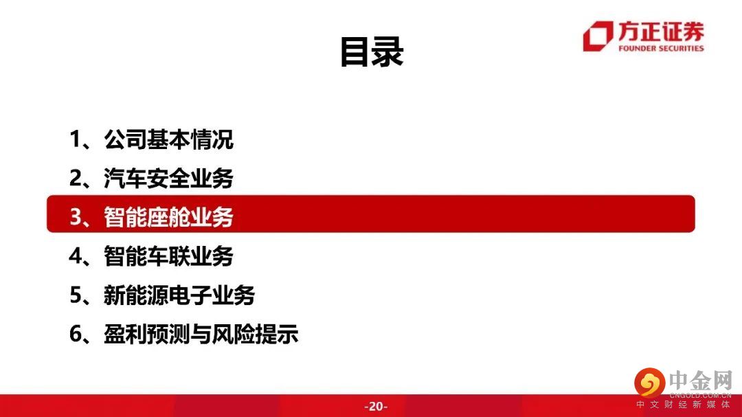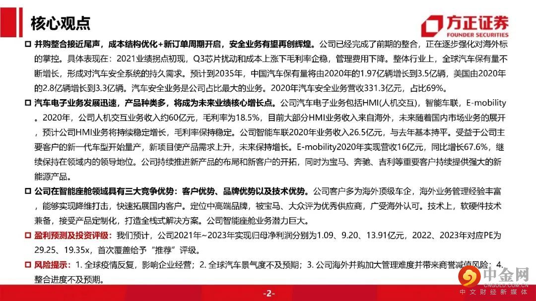 公司在智能座舱领域具有三大竞争优势:客户优势、品牌优势以及技术优势。公司客户多为海外顶级车企,海外业务管理经验丰富,能够实现降维打击,快速拓展国内客户。定位中高端品牌,被宝马、大众评为优秀供应商,广受海外认可。技术上,软硬件技术兼备,接受产品定制化,打造全栈式解决方案。公司智能座舱业务潜力巨大。盈利预测及投资评级:我们预计,公司2021年~2023年实现归母净利润分别为1.09、9.20、13.91亿元,2022、2023年对应PE为29.25、19.35x,首次覆盖给予“推荐”评级。风险提示:全球疫情反复,影响企业经营;全球汽车景气度不及预期;公司海外并购加大管理难度并带来商誉减值风险;整合进度不及预期。