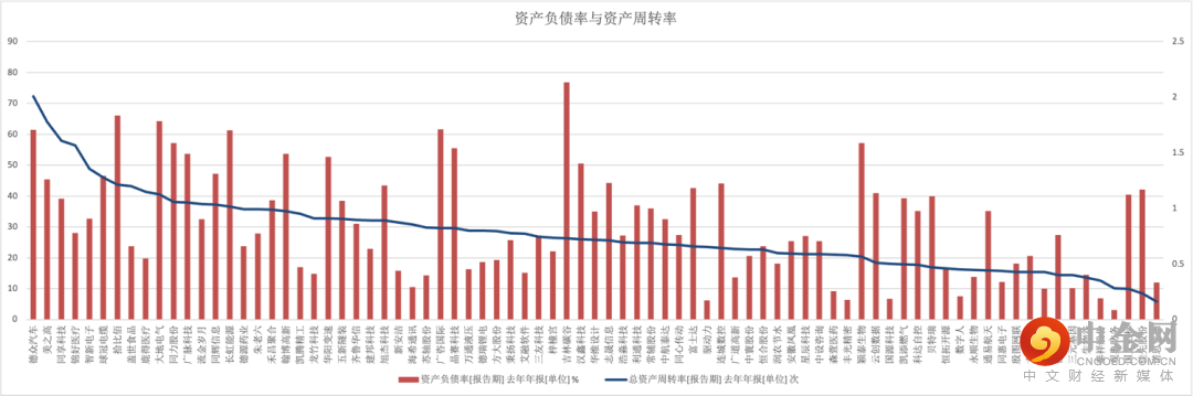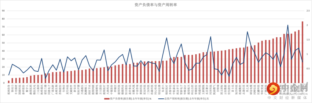 81家上市公司资产负债率平均数为30.65%,中位数为27.36%。资产负债率最高的是吉林碳谷,达76.86%,所属行业为制造业,主营业务为合成纤维;最低的是观典防务,为3.07%,所属行业为科学研究和技术服务业,主营业务为IT产品销售、专业咨询服务。81家公司的资产负债率基本分布在3-80%,排名前十为:观典防务、驱动力、丰光精密、国源科技、泰祥股份、数字人、森萱医药、微创光电、三元基因、海希通讯。