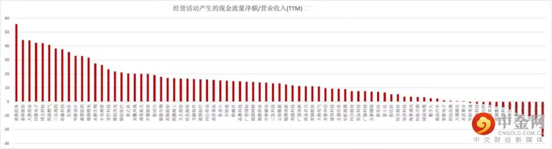 81家上市公司经营活动产生的现金流量净额/营业收入(TTM)平均值为13.42%,中位数为13.26%。该指标最高的是观典防务,达到55.86%,所属行业为科学研究和技术服务业,主营业务为IT产品销售、专业咨询服务;最低的是诺思兰德,为-25.05%,所属行业为制造业,主营业务为营养补充类制剂。共有69家公司经营活动产生的现金流量净额/营业收入(TTM)为正,除观典防务外,共有68家公司现金流量净额/营业收入(TTM)分布在0-50%的范围,排名前十为:观典防务、泰祥股份、大唐药业、同惠电子、国义招标、凯添燃气、三元基因、浩淼科技、生物谷、华维设计。