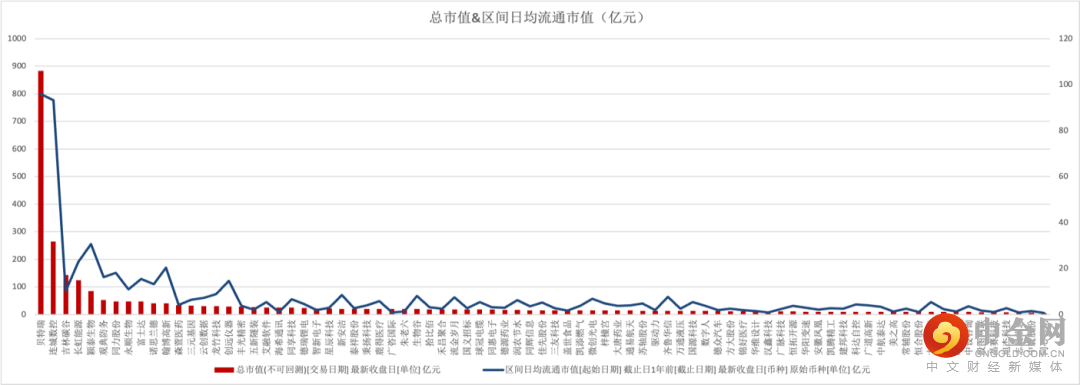 81家上市公司平均市值为35.40亿元,市值中位数为15.33亿元。总市值最高的是贝特瑞,达882.86亿元,所属行业为制造业,主营业务为超硬材料、低压电器类;最低的是同心传动,为4.05亿,所属行业为汽车零配件与设备,主营业务是专业研发制造各类汽车转向装置传动轴的大型企业。平均区间日均流通市值为7.44亿元,流通市值中位数为3.63亿元。在新三板精选层81家公司中,区间日均流通市值最高的仍为贝特瑞,达到95.76亿元;最低的是同心传动,为0.66亿,所属行业为汽车零配件与设备,除贝特瑞和连城数控(总市值258.34亿元)外,其余79家公司的总市值和区间日均流通市值基本分布在5-100亿元,总市值排名前十为贝特瑞、连城数控、吉林碳谷、长虹能源、颖泰生物、观典防务、同力股份、永顺生物、富士达、诺思兰德;流通市值排名前十为:贝特瑞、连城数控、颖泰生物、长虹能源、翰博高新、同力股份、观典防务、富士达、创远仪器、诺思兰德。