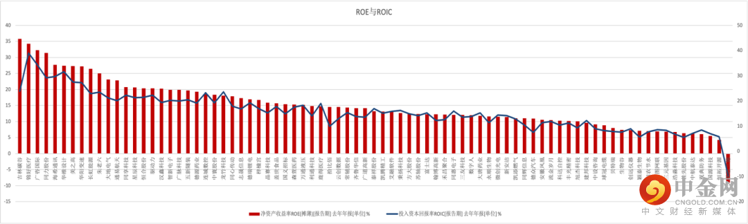 81家上市公司平均ROE为14.92%,中位数为13.25%。ROE最高的是吉林碳谷,达到35.82%,所属行业为制造业,主营业务为合成纤维;最低的是诺思兰德,为-9.12%,所属行业为制造业,主营业务为营养补充类制剂。除诺思兰德外,其余80家公司的ROE均为正,基本分布在4-35%,ROE排名前十为吉林碳谷、锦好医疗、广咨国际、同力股份、海希通讯、华维设计、美之高、华阳变速、长虹能源、朱老六。平均ROIC为15.63%,ROIC中位数为15.11%。ROIC最高的为锦好医疗,达38.97%;最低的是诺思兰德,为-9.8%。除诺思兰德外,其余80家公司ROIC均为正,基本分布在5-40%的范围,ROIC排名前十为:锦好医疗、广咨国际、华维设计、海希通讯、同力股份、美之高、华阳变速、吉林碳谷、龙竹科技、朱老六。