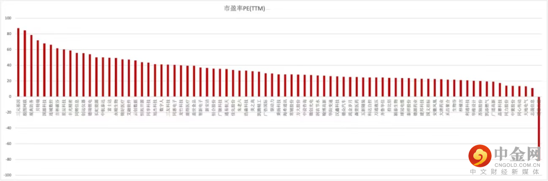 81家上市公司市盈率(TTM)的平均值为33.70倍,中位数为28.32倍。PE最高的是三元基因,达到87.14倍,所属行业为制造业,主营业务为医药中间体;最低的是诺思兰德,所属行业为制造业,主营业务为营养补充类制剂;除诺思兰德外,其余81家公司PE(TTM)均为正值,市盈率(TTM)基本分布在10-100倍的范围,排名前十为:三元基因、殷图网联、观典防务、贝特瑞、国源科技、连城数控、吉林碳谷、星辰科技、丰光精密、同辉信息。