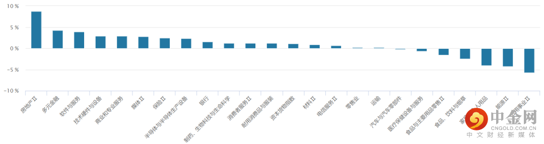 从行业板块表现来看,房地产、多元金融、软件与服务板块表现靠前,而公用事业、能源板块等表现相对较弱。(见图2)