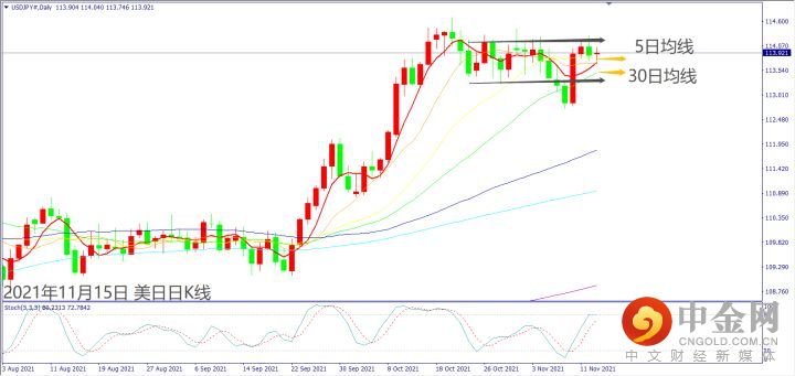 日级别线图,高点回落跌破114.00关口,5日均线若掼破,可能回测30日均线。