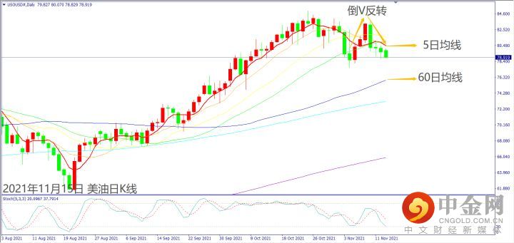 日级别线图,连3根阴烛形成倒V反转,5日均线盖头反压,可能回测60日均线。