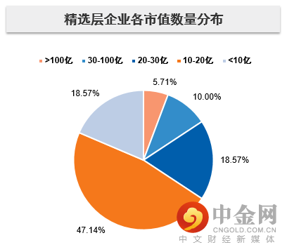 回到新三板中的精选层公司看,目前上市公司目前共71家,其中超百亿市值的有4家,目前数量占比5.71%,但市值占比达51.75%,其中最大市值企业占比达31.5%,市值集中度比高,大多数市值低于30亿。目前上市企业较少,后续快速增加的可能相对比较大,所以以下数据仅作为参考之用。