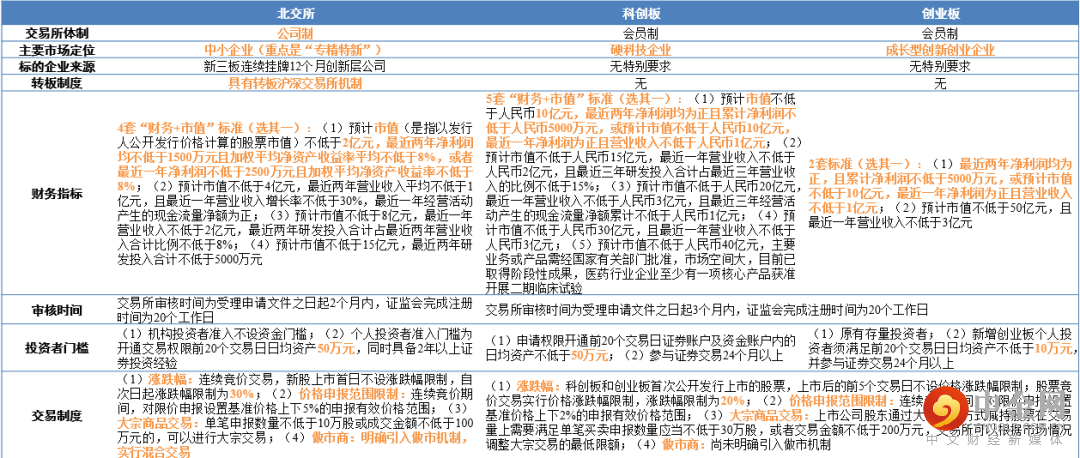 从全局的角度来说,北交所承上,作为主板蓝筹、科创、创业板的补充,同时启下,完善了一级市场PE/VC的退出机制。那么作为承接中国创新命题的三个板块有什么区别呢,对比如下: