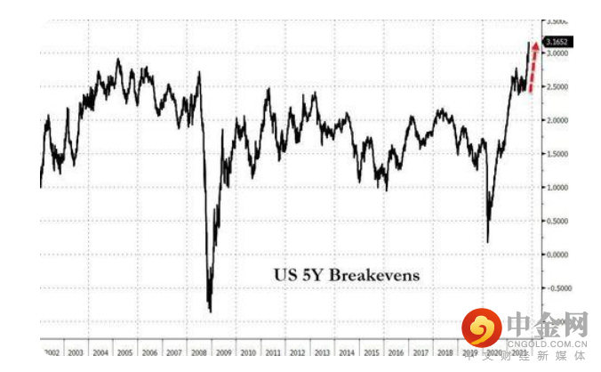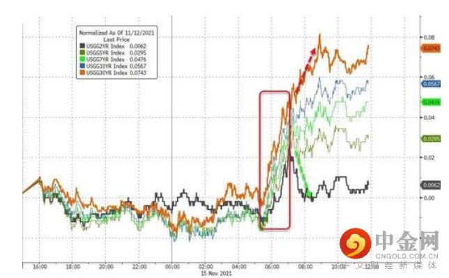 美债收益率随之重启升势。美国10年期国债收益率一度升至1.63%,为10月27日以来的最高水平。美国30年期国债收益率11月4日以来首次站上2%。美国5年期通胀保值债券(TIPS)升至3.166%,创历史新高。