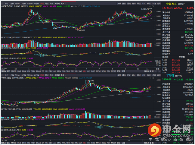 股谚云,市场行为反映一切信息。也就是说,市场的资金都是聪明的,会提前挖掘并反映未来的信息。如果,未来某些板块有行情的话,想必会有聪明资金提前行动布局,反映到价格上来的话就是对应的板块指数在悄悄走强。从下面两张图我们可以看到,中证军工指数(399967)近期连续走强并创了近3年新高,强势明显。而另外的半导体指数(880491)近期也在温和放量上涨,与大盘的调整走势截然不同,这说明已经有聪明资金在积极布局上述两个板块了,这从侧面也支撑了我们对于跨年行情或将发生的判断。