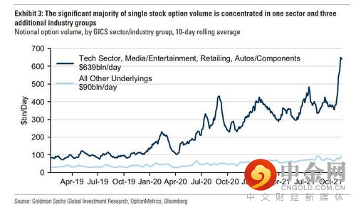 这与高盛衍生品专家在11月11日发表的研究报告想表达的观点一致:即此前两周87% 的名义期权交易量来自四个领域:科技部门(最活跃的底层证券是苹果、英伟达、微软、AMD)、媒体和娱乐(谷歌和奈飞等)、以及非必需消费品部门的零售(亚马逊)和汽车(特斯拉)等。