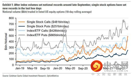 还在报告中指出,指数期权交易量在今年9月下旬跃升(9月20日达到峰值1.8万亿美元),而最近的单股交易量激增(11月5日达到峰值9450亿美元)使得整体期权交易量接近创纪录水平。