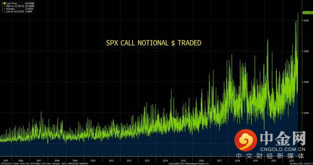 他提到了自己近期对市场的观察结果,首先是标普500指数看涨期权名义交易量在11月5日创下历史新高,存在期权看涨偏斜情况。
