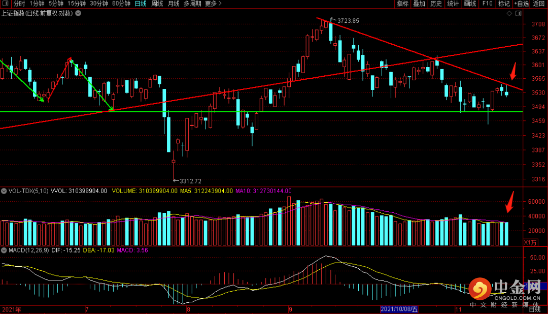大盘在大阳后出现连续三天横盘震荡走势,短期需要关注是否快速突破下降趋势线,如果无法突破则大概率还会有一笔向下的回踩走势,关注下方3509附近的平台支撑。在没有跌破之前大概率不会有大的下跌。
