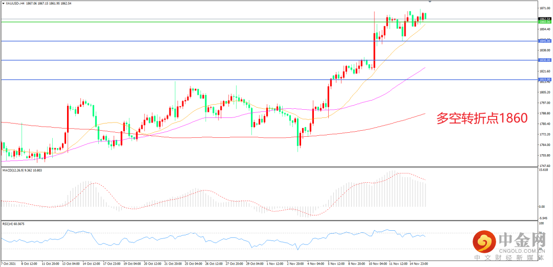 4小时图看,金价连续拉升后高位震荡,短期走势偏强,均线系统成为下方支撑,1860成为多空分水岭,MACD红柱缩短,RSI指标走平,日内震荡上行概率较大。