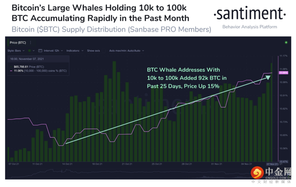 BTC 在周一早些时候实现了重大飞跃,并攀升至 66,000 美元以上。持有 10k 到 100k BTC 的大型鲸鱼地址已经累积了 43,000 多个 BTC,并且在前 5 天内增加了 +2.1% 的持有量。