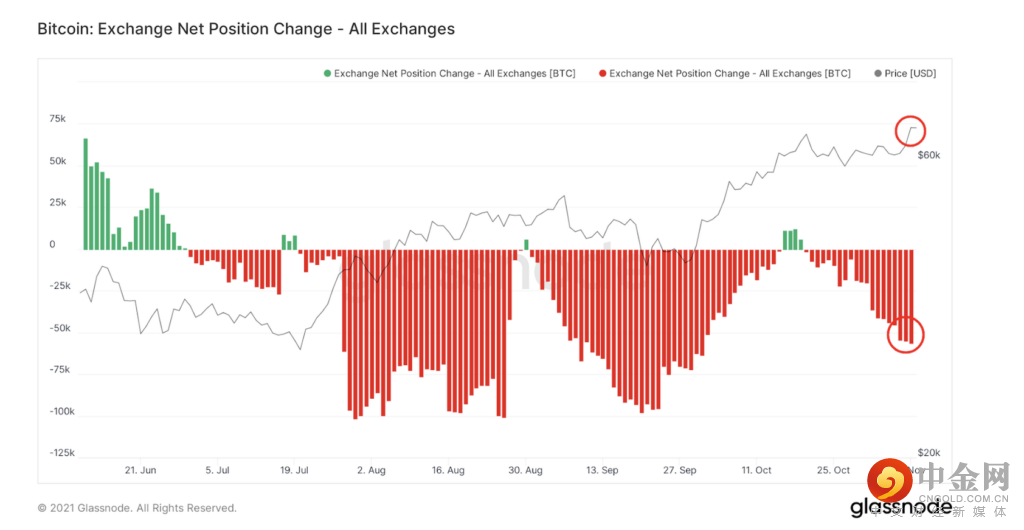 支持 BTC 价格上涨的另一个因素是,即使在周中下跌期间,BTC 的增持也继续保持强劲势头,这导致交易所的 BTC 储备再次走低。