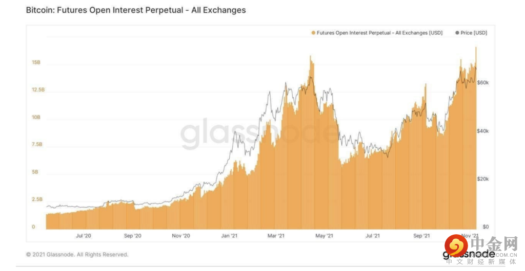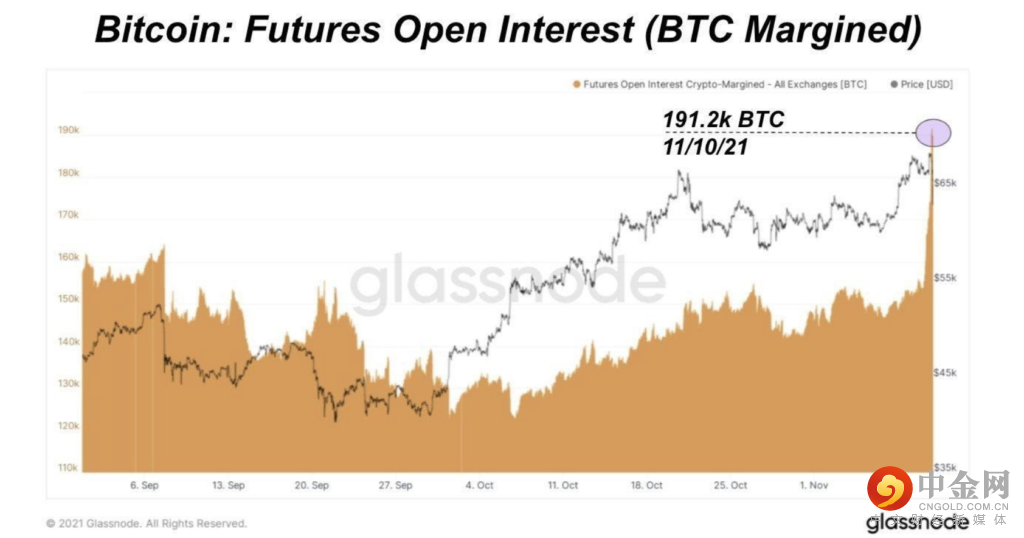 上面同一张图表的特写版本更清楚地显示了随着 BTC 价格突破 ATH,期货市场中 BTC 未平仓合约的上涨程度,这不可能是可持续的。
