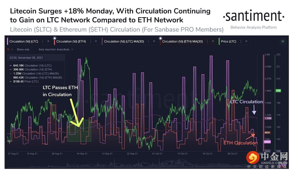 几乎被许多交易者遗忘的旧宠 LTC 突然活跃起来,在显示 LTC 交易量开始增加后,上涨了约 50% 至 300 美元的高位。LTC 流通的代币数量,现在每天 125 万个,以越来越大的幅度超过 ETH。由于与 ETH 相比,LTC 的 gas 费用相对较低,交易者可能会购买 LTC 来发送。ETH 费用高昂,现在转移的频率降低了,更多地被投资者视为投资和耕种的代币。