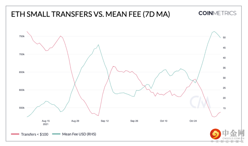 高额费用开始让某些经济活动(例如小额转账)定价。正如我们在上面看到的,这导致 LTC 转账数量增加。