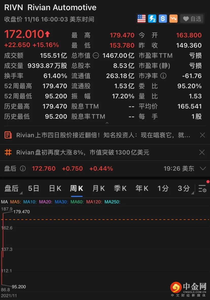 该公司股价11月16日上涨15%,收于172.010美元/股。自上市以来股价已累计上涨超120%。