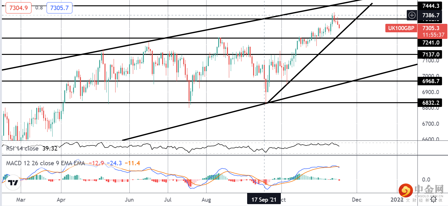 英镑升值和英国央行将收紧的预期显然是英国资产价格的阻力。富时指数目前正从高于7362.6点的水平上向下修正,MACD已转为负值,RSI指向下方。关键的观察区域是当地的上升趋势线和7241水平。这里的突破将是一个坚定的熊市发展,下一步将焦点转向7137的测试。