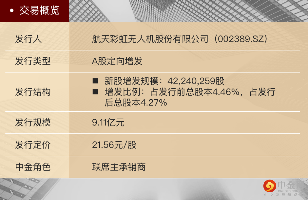 航天科技集团及其成员单位是中金公司“以国为怀”文化下具有战略意义的核心客户之一。本次航天彩虹非公开发行项目是中金公司持续服务航天科技集团的又一重要里程碑项目。中金公司通过长期的综合性金融服务不断为航天科技集团发展助力。