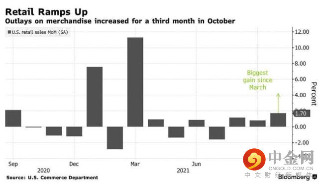 周二黄金从高位回落,主要是因为有恐怖数据之称的,美国10月零售销售增幅超预期。美国政府数据显示,美国10月份零售额上升1.7%,这是自3月份以来的最大增幅,另外10月份工业生产也增长了1.6%。据调查这一增幅超出了0.8%的预期。这俩份数据表面,消费者似乎不是很在意通胀的上涨,对于相对高的商品价格,依然保持强劲的消费势头,做为支撑GDP主要的消费数据的的爆涨,使得市场预计美国第四季度经济将变的乐观,因为此前市场普遍预期高通胀数据将挤压购买力。