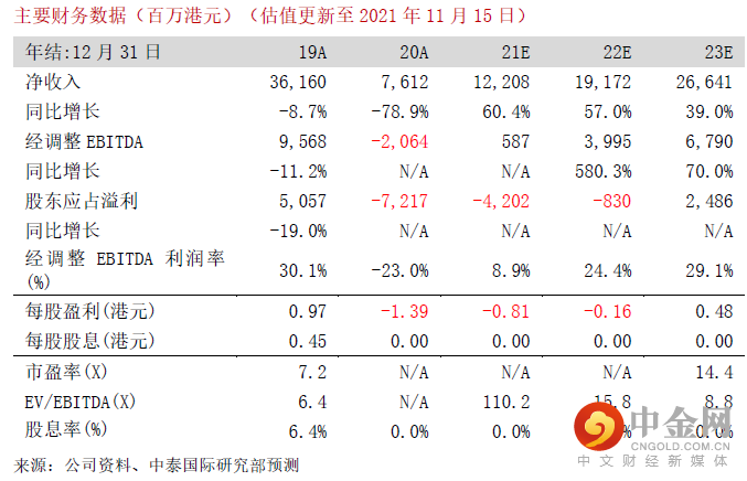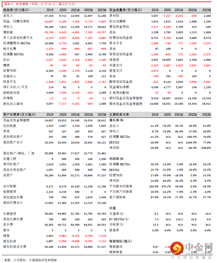基于Q3的业绩及近期的疫情发展,我们分别下调公司21-23年经调整EBIDTA预测80.3%/50.8%/33.0%至5.9亿/39.9亿/67.9亿港元,将目标价从7.16港元下调至6.16港元,相当于22年/23年14.9倍及8.3倍EV/EBITDA。虽然公司股价自《博彩法》咨询文件于9月15日出台后累计跌幅达22.5%,但我们认为短期股价仍将跑输同业。永利拥有较高的贵宾厅风险敞口,在当前内地经济放缓压力增加及加强监管跨境资金外流的背景下较为不利。