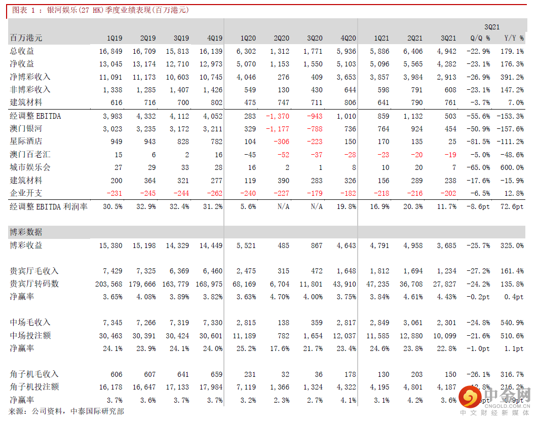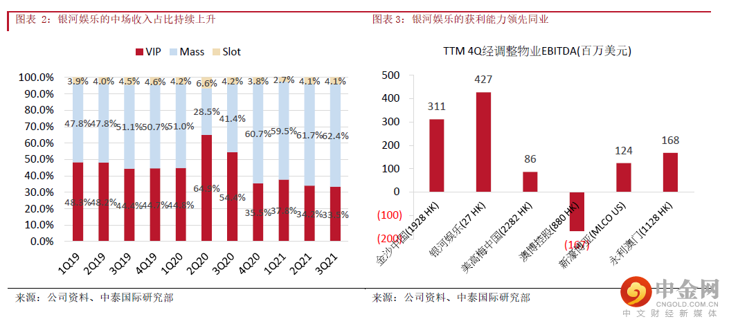 银河娱乐2021年Q3净收入为42.8亿港元(下同),同比176.3%/环比-23.1%;中场博彩收入环比-24.8%,与行业平均(-24.5%)同步;集团经调整EBITDA为5.03亿元(环比-55.6%,同比亏转盈),略优于我们预期(4.5亿),主因较高利润率的中场占比提升,以及保持严格的成本控制措施。虽然本季度澳门银河的商场零售收入环比-36.4%,但相信在放宽出入境管制后高端零售将大幅反弹。公司的澳门博彩相关业务的经调整物业EBITDA为4.7亿元,已恢复至19年同期的11.7%,恢复速度大幅领先同业。银河娱乐最近四季(TTM 4Q)共录得4.3亿美元的经调整物业EBITDA,优于金沙(1928 HK)、永利澳门(1128 HK)、新濠博亚(MLCO US)、美高梅中国(2282 HK)及澳博(880 HK)分别的3.1亿/1.7亿/1.2亿/0.86亿/-1.7亿美元,获利能力大幅领先同业。
