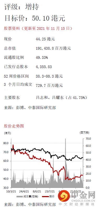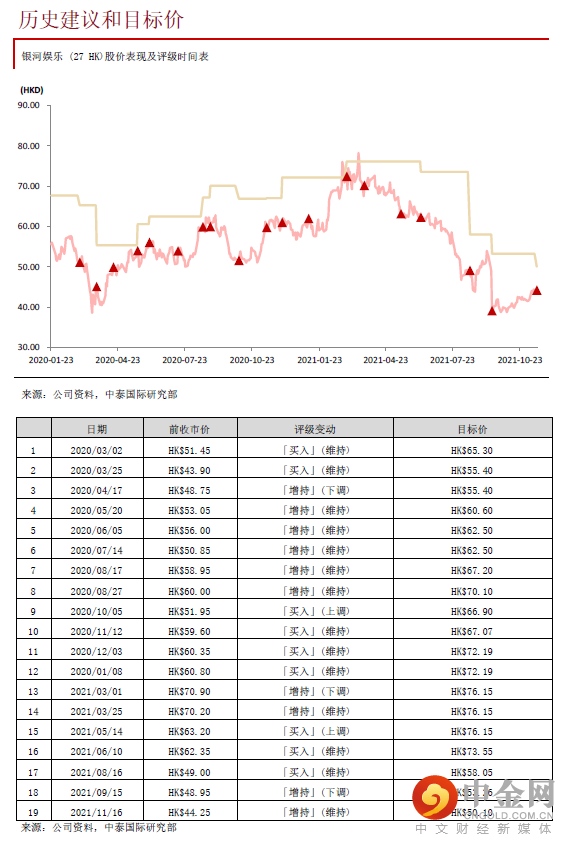 基于Q3的业绩,我们上调21年经调整EBIDTA预测12.5%至30.6亿元,但分别下调22及23年的预测9.0%/8.7%至77.9亿及146.7亿元,以反映近期疫情反复导致下一阶段大规模放宽出入境管制措施的时间延迟。目标价从53.26港元下调至50.10港元,相当于22/23年分别23.6/12.3倍EV/EBITDA,维持“增持”评级。考虑到公司1) 优秀的营运效率;2) 较高的潜在增长;3) 较低的续牌不确定性;4) 庞大的高端中场业务;5) 非常健康的资产负债表(278亿港元的净现金),我们仍视公司为博彩股中的首选。银河娱乐股价年初至今(截至11月15日)跌幅仅26.6%大幅跑赢同业(平均-42.4%),反映资本市场较为惜售。