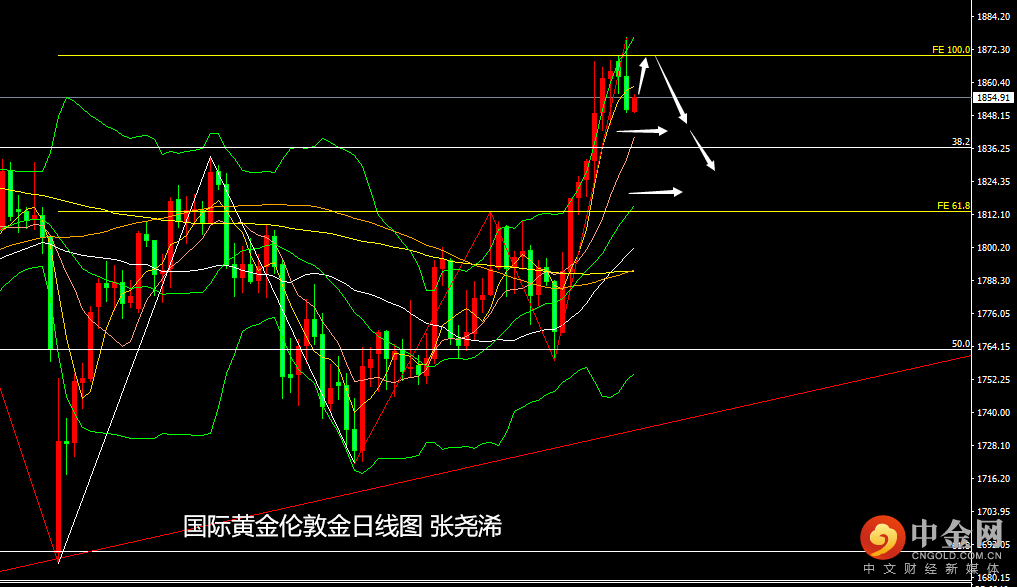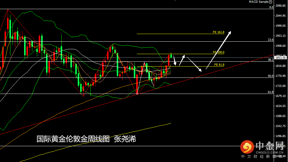 技术上:周线级别:金价本周冲击1870美元上方后,力度未能增强,而是产生较大回落,暗示阻力压制大,后市存在回落需求,将有回撤至38.2%回撤线1836美元附近或5周均线附近的支撑位置。整体上,在站稳1870美元前,金价偏高位承压震荡。下方关注5周线支撑不破保持看涨。
