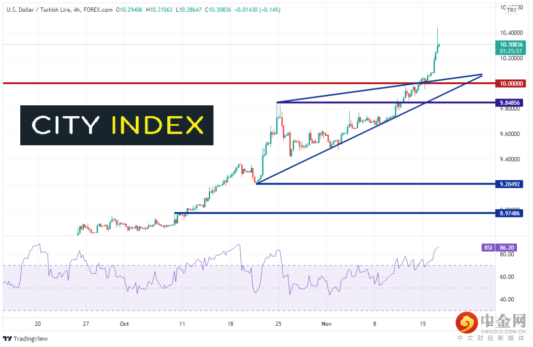 美元/土耳其里拉周一击穿10.00,周二大举上攻,摸至10.4386,接近3.8%的日图波动区间高点。自从9月7日触及8.2718之后,美元/土耳其里拉高歌猛进,涨逾26%。这种一开始看似由全球通胀上涨引发的走势已变成土耳其总统Erdogan个人的奇观。Erdogan曾表示,不希望土耳其央行加息,尽管最新的10月通胀年率高达19.89%,其中贡献最大的是食品价格的上涨。Erdogan甚至解雇那些反对降息的央行行长,代之以愿意降息的人选。所以,土耳其央行在上次会议上降息200个基点,将基准利率从18%下调至16%,幅度远高于市场预期的50个基点。在土耳其高通胀和降息以及美国通胀(上涨但涨幅为远低于预期的6.2%)和美联储处于缩表/“很快加息”模式的联袂作用下,美元/土耳其里拉每日都创下新高。