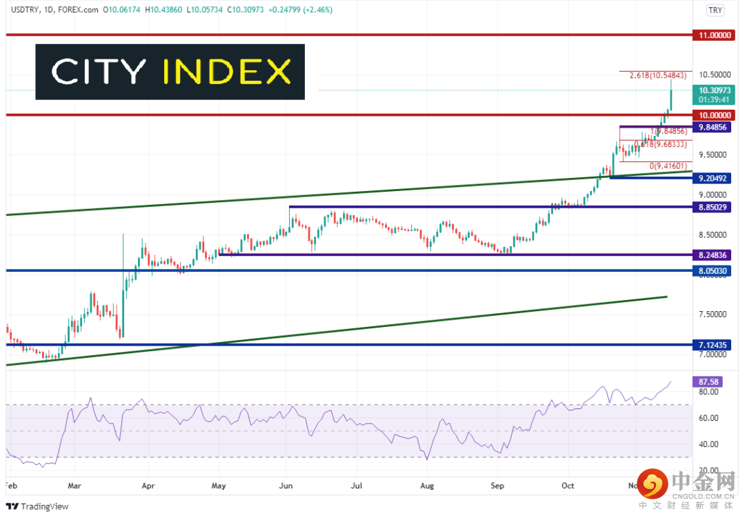 美元/土耳其里拉过去几周抛物线式上涨,上破至10上方的历史新高且途中攻克止损单。那么,站上10只是土耳其央行会议召开前的“听传闻买进、见事实沽出”行情吗?如果土耳其央行一如预期降息100个基点,或降息幅度不到100个基点,请小心美元/土耳其里拉暴跌的可能性。
