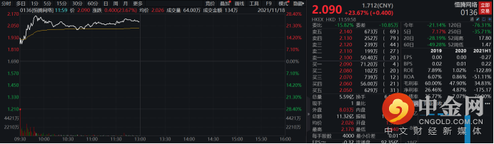 值得注意的是,因恒大清仓式减持,恒腾网络盘中一度大涨近30%。截至收盘,涨23.67%,报2.09港元/股。