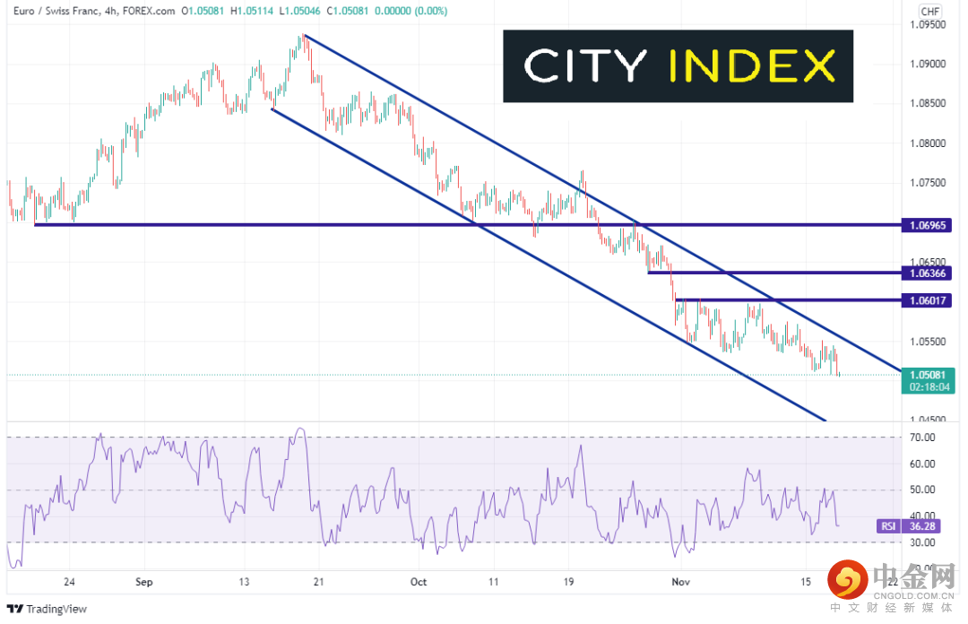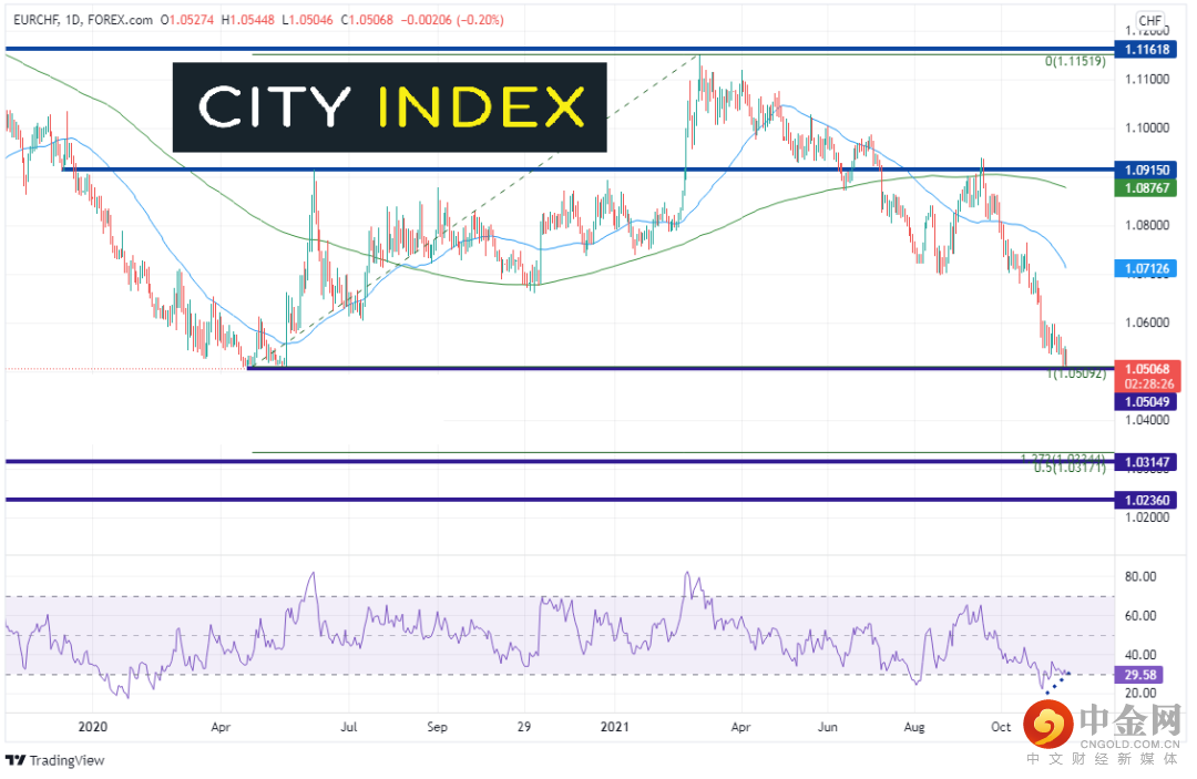 欧元/瑞郎缓慢但坚定地上涨并在2018年年中测试了1.2000,只是后来屈服于抛压再次走弱。然后就来到了今天。该货币对目前落在2020年5月的最新低点构成的水平支撑位1.0505附近,如果失守,可能跌至2015年7月以来最低点。第一支撑位在下图4小时图上的1.0440附近,但如果攻克,下一支撑位在遥远的1.0334附近,那是2020年5月低点到2021年3月4日高点行情的127.2%扩展位。该位之下不远处就是2015年6月以来水平支撑位1.0314,然后是2015年1月15日低点(基于Tradingview的低点)到2018年年中高点行情的50%回档位,也在1.0314附近,再接着就是遥远的1.0236附近,那是2015年4月低点。请注意,RSI正与价格(正落在支撑位)背离,表明欧元/瑞郎或蓄势准备反弹。