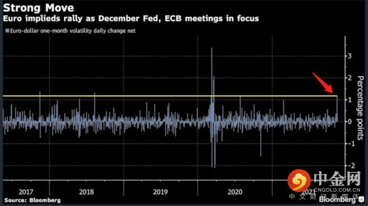 衍生品市场显示,近一个月欧元兑美元的隐含波动率在过去飙升了整整一个百分点。隐含波动率是溢价的关键决定因素,而该数值创下了几月来新高,这表明随着欧洲和美国12月政策声明的到来,潜在波动在逐渐加剧。此外,欧元看跌期权比看涨期权的额外溢价越来越高,也反映了市场对欧元下行的押注。