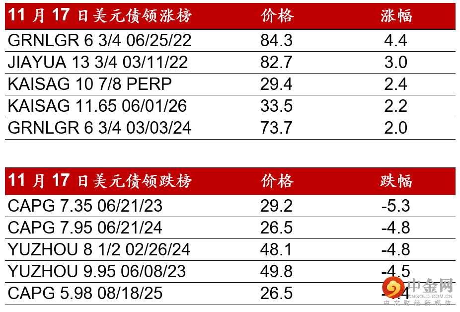 昨日(11月17日),中国高收益债券市场延续昨日较弱的情绪,大部分债券仍有所回撤。奥园在标普下调评级至CCC后持续下跌约5-10pts。其他高收益债券亦下跌1-3pts,禹洲表现较大市弱,下跌2-4pts。较高评级债券如世茂/碧桂园早上下跌2-3pts,但午后受监管将允许ABS重启发行的消息推动,价格回升至前天水平。