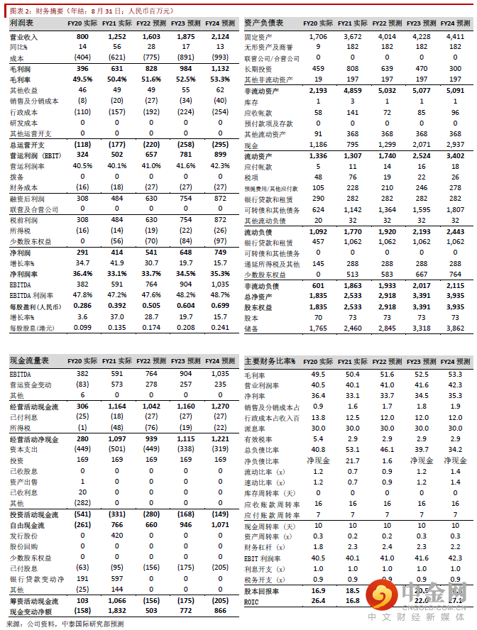 中汇集团公布FY21业绩,FY21收入12.5亿人民币(下同),同比增长56.4% ,符合预期。受到收购四川城市职业学院和四川城市技师学院带动(今年1月以7.5亿元人民币对价收购51%股权),集团在校生人数为6.2万人,同比增长76.8%。毛利率提升0.9百分点至50.4%。销售及行政费用1.8亿,占收入14.1%,去年同期14.7%。净利润4.1亿,同比增长41.9%,净利润率33.1%。剔除非现金开支,调整后净利润4.6亿元。期内公司有息负债从7.5亿增加至13.4亿,财务开支仅增加14.5%,低于预期。公司维持30%派息率,派发期末股息0.084港元。2021/22学年新生报到人数2.6万,总在校生增至7.2万人。