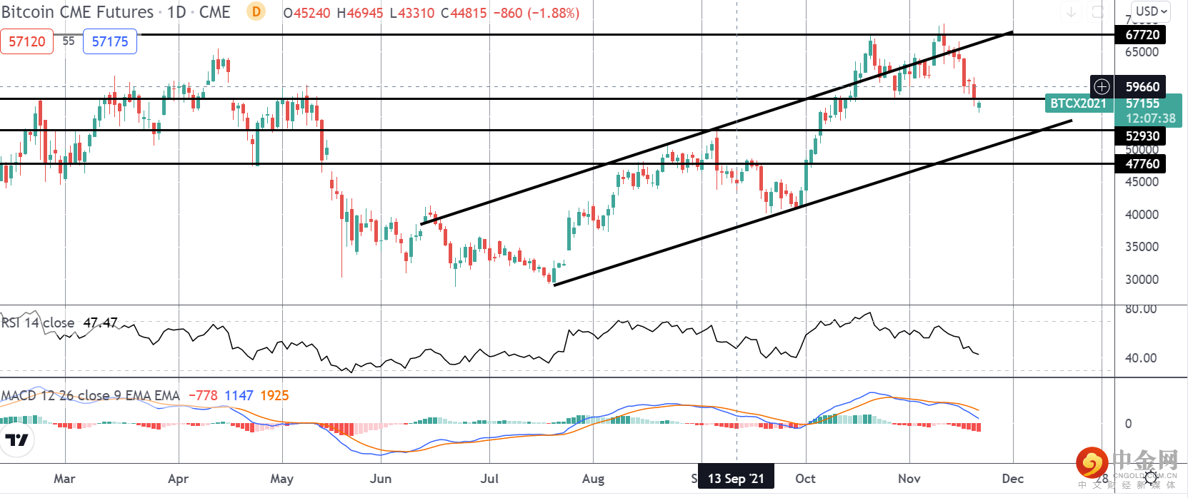 最近反弹至67720点,伴随着动量研究中大量的熊市分歧,随后的反转导致价格交易回到牛市通道。Price现在正在测试57805级别的支持。此处下方的中断将使52930成为焦点,同时上升通道低点。然而,如果多头能在这里保持支撑,焦点将继续放在进一步上涨上。
