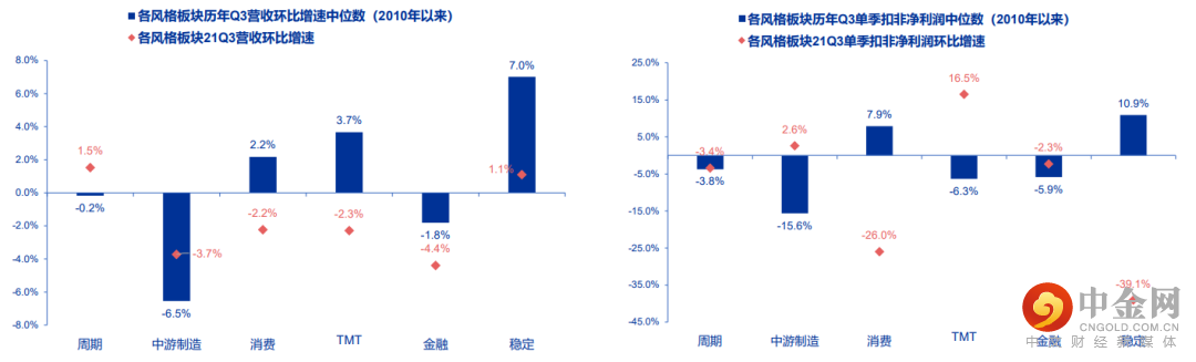 从大类板块来看,周期板块营收和利润环比增速都好于季节性,而消费板块出现了较为明显的下滑。从营收的角度看,周期板块21Q3环比增长1.5%,强于2010年以来的平均季节性(-0.2%),而消费/TMT/金融板块都弱于平均季节性。从利润端看,消费和稳定板块21年Q3单季度扣非净利润环比增速只有-26%和-39.1%,大幅低于平均季节性,其中消费中绝大多数子行业利润出现环比下滑,稳定板块中主要受物流和航空机场拖累。