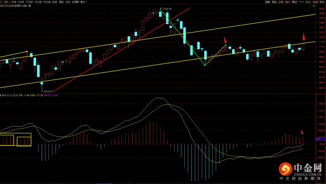 中证500再次面临上升趋势线下轨压制,短期需要注意突破的量能,如果继续维持无量则可能出现再次的回落,而下方支撑则需要关注7127附近的平台支撑。