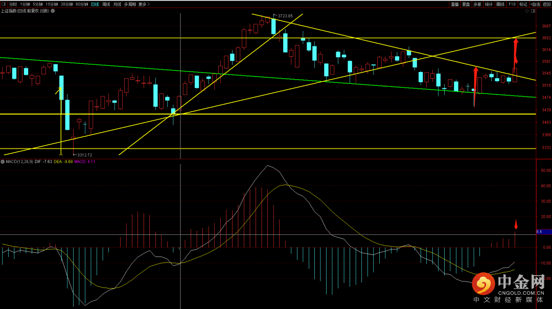大盘周五出现突破下降趋势线,短期重点关注是否能够维持在趋势线之上,如果可以后续大概率会去向上回补前期的跳空缺口,压制大概率会出现在3615到3645平台。而短期下方重点关注3530的支撑。