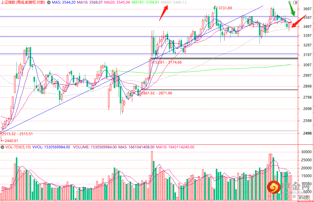 首先,我们先看看上证指数周K线走势。