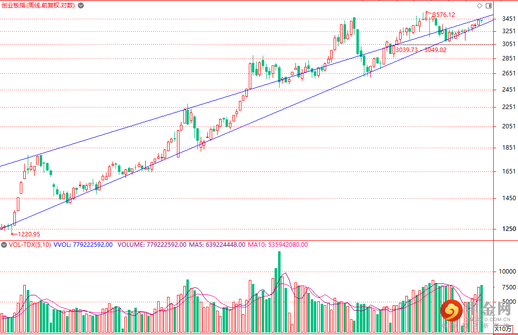 然后,我们看看创业板指数周K线走势。