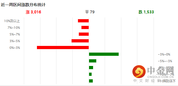 个股方面,本周个股涨多跌少,两市3016只个股收涨,1533只个股收跌。大多数个股涨幅集中在0-3%之间,证明赚钱效应较好。(见图6)