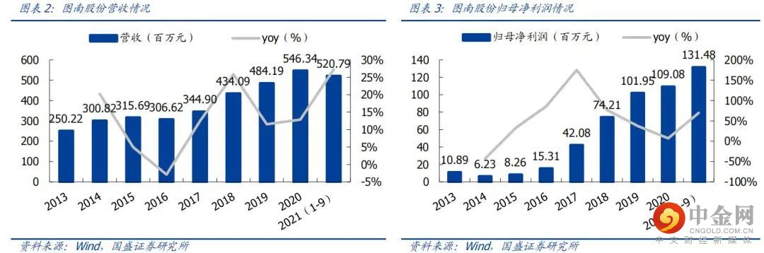 图南股份深耕高温合金产业超20年,是国内少数能同时批量化生产变形高温合金、铸造高温合金(母合金、精密铸件)产品的企业之一,尤其是其“精铸机匣”代表性产品使其成为国内少有的航发产业链具有爆款产品的民参军企业。随着2015年公司精密铸件多个型号产品批量供货,实现营收和业绩实现快速增长。2021年前三季度,公司实现营收(5.21亿元,+27.23%),归母净利润(1.31亿元,+69.31%)。目前我国两机“航空发动机与燃气轮机”进入快速发展阶段,公司将迈入高确定性的成长阶段。