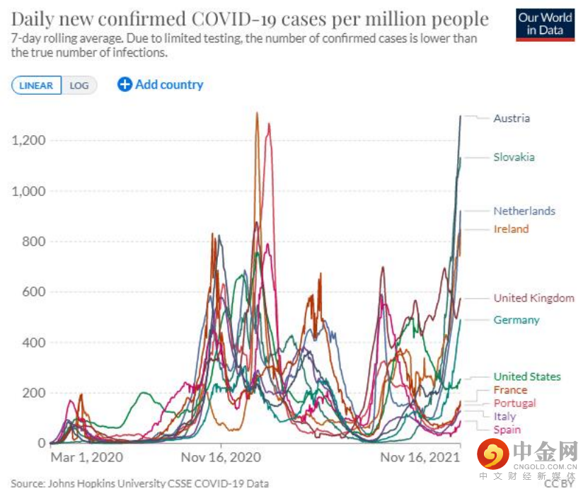 首先是,欧洲经济的“火车头”德国。据德国疾控机构的最新数据,11月20日新增确诊病例数为63924例,这已是连续4天单日新增超过5万。疾控机构警告称,若德国无法减少社交接触并确保足够多的人接种疫苗,恐将暴发第5波疫情。此前,德国总理默克尔警告称,第四波疫情正在全速袭击德国,单日死亡病例令人恐惧。