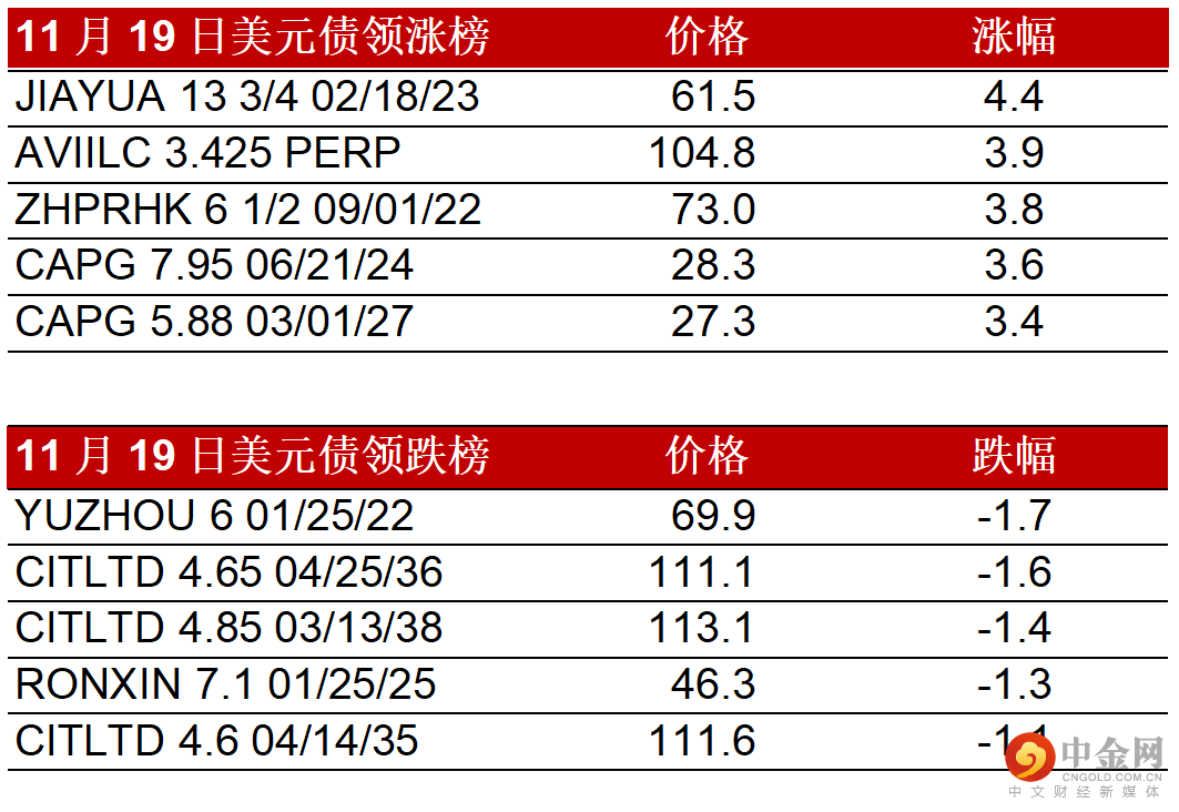 上周五(11月19日),中国高收益债券市场整体交投较少,但整体情绪仍然有所好转。在公司美元债券交换要约通过消息推进,阳光城反弹约3-5pts,奥园也在进一步优化ABS/ABN展期方案的消息后上涨约3-5pts,其他债券如融创/佳兆业也在较好买盘下上涨约2-3pts。较好评级债券如龙光/新城/时代上涨约1.5-2pts,碧桂园/雅居乐/世茂/旭辉也小幅上涨约0.5-1pt。