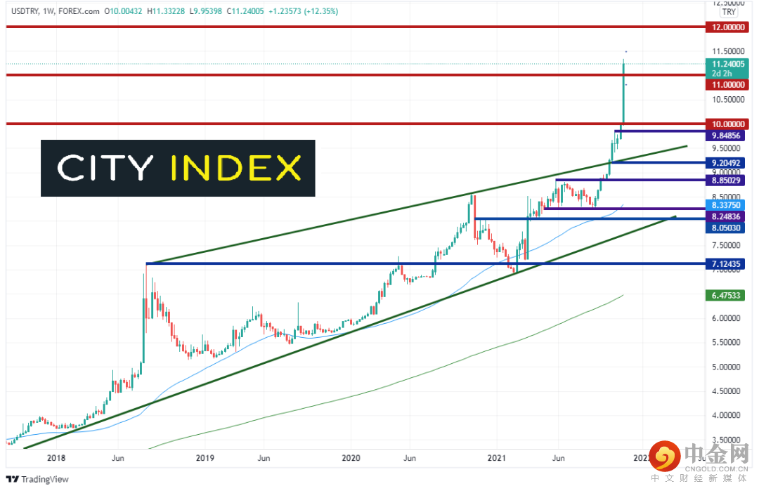 在《每周重点关注图表》中说过的关注对象,我们在接下来的一周通常不会有新的观点,美元/土耳其里拉也不例外。该货币对上周从周一的开盘价10.0043上涨至周五收盘价11.2391附近,抛物线式上涨12.34%。在此前价格站上9.00时我们就曾问过其将多快突破10.00的问题,然后是多快摸至11.00。现在我想问的是:击穿12.00需要多久?这个问题没有确定的答案,但与抛物线式行情作对的难度是非常高的。土耳其央行上周降息100个基点,声称将在12月重新评估降息决策。但只要Erdogan继续主导土耳其央行,很多人认为该国继续降息。美元/土耳其里拉的下个阻力位在心理整数关口12.00,支撑位在上周低点9.9554,然后是下方不远处的水平支撑位9.8486,接着是10月11日曾突破的上升趋势线所在的9.2875附近。如果Erdogan关于利率的评论有任何温和程度降低的地方,请小心该货币对大举回撤。另外,如果空头入场,请留意止损被引发,继而带动货币对回到一周低点。